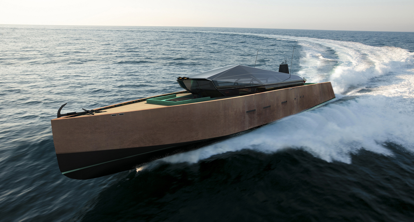 Bryła jachtu jest minimalistyczna. Rudy, rdzawy kadłub, szklana bryła nadbudówki i odważnie sterczący w górę komin. Oryginalnie wyeksponowana stara kotwica może wiele powiedzieć o temperamencie właściciela jachtu. Człowieka nietuzinkowego, prawdziwego, bez zadęcia. Przyszły właściciel jachtu ma do dyspozycji otwarta przestrzeń głównego pokładu połączoną ze sterówką. Kabina VIP z osobną łazienką znajduje się na dziobie dolnego pokładu. Przed kajutą VIP znajdują się 2 kabiny dla gość, kabiny załogi (6 osób) oraz kuchnia z wejściem do maszynowni. Większość pomieszczeń wnętrza jest malowana na jednolity kolor (np. biały). Pozwala to racjonalizować koszty i wprowadzają element wizualnej czystości. Pojedyncze kolorowe ściany wnętrz zdobione są starym graffiti i pozyskanymi z recyklingu kafelkami.